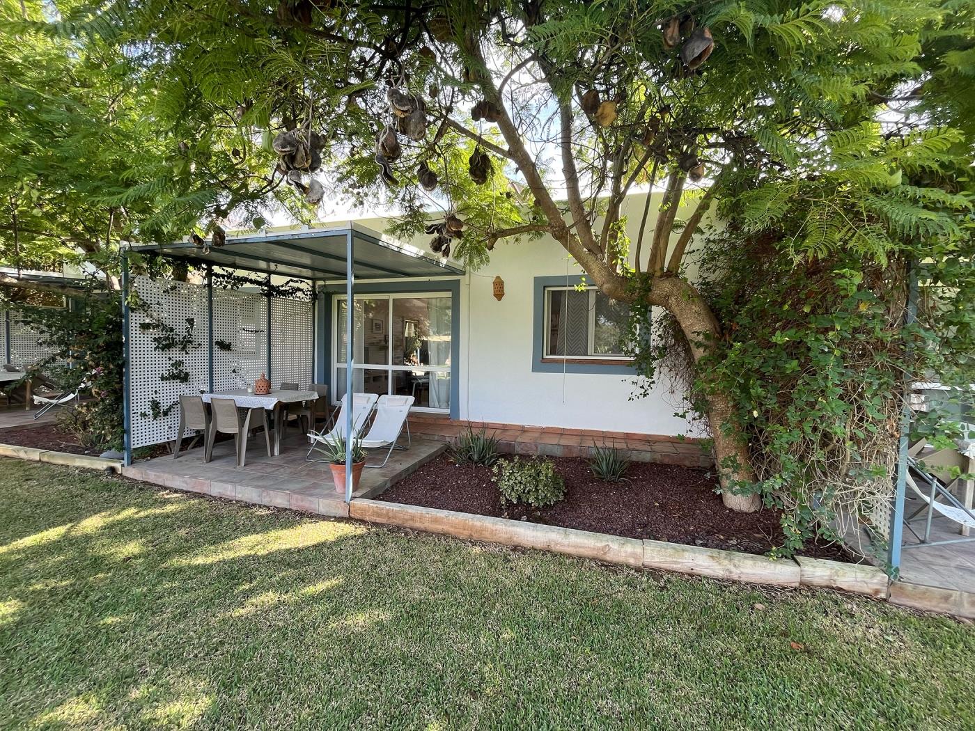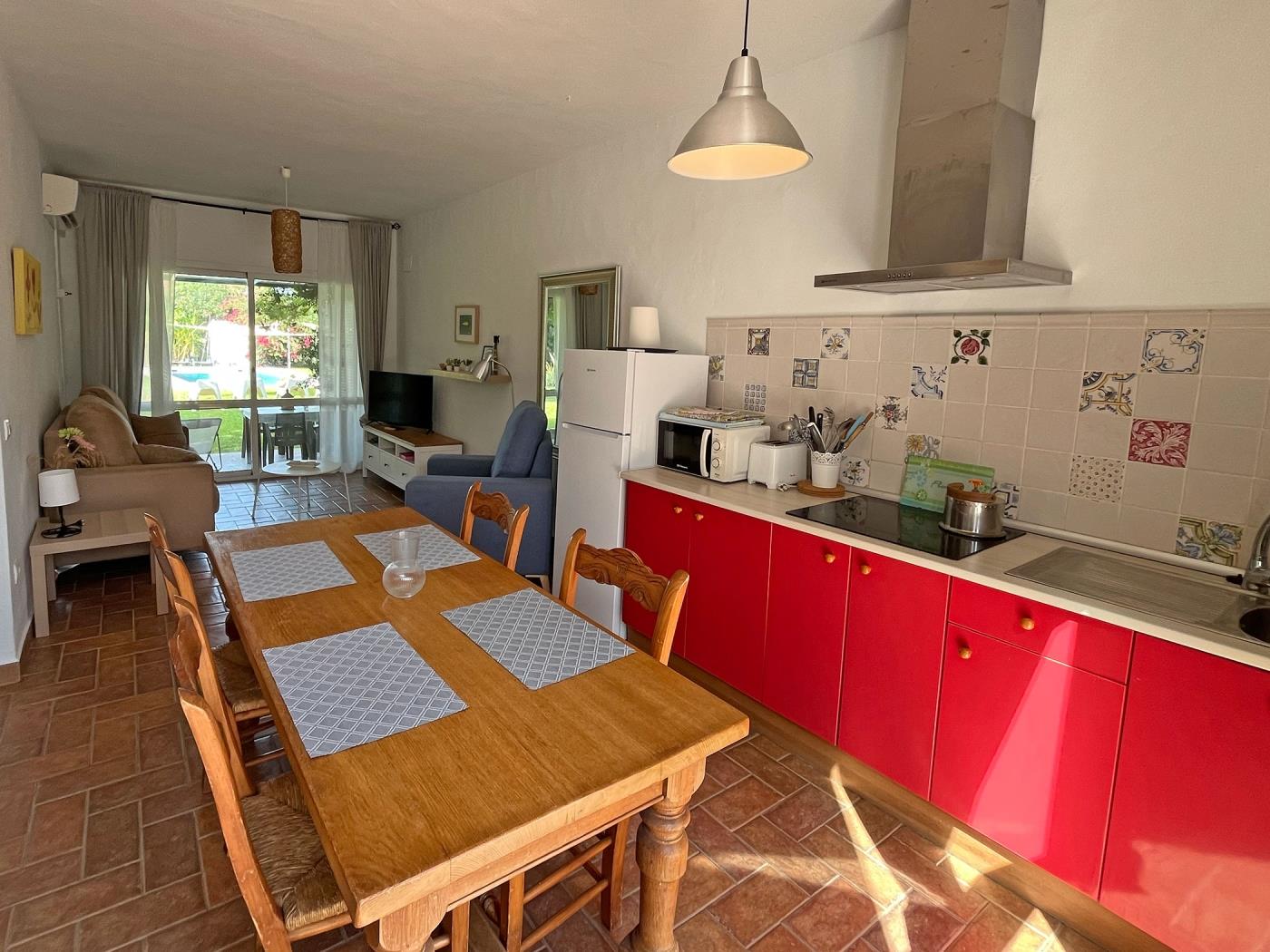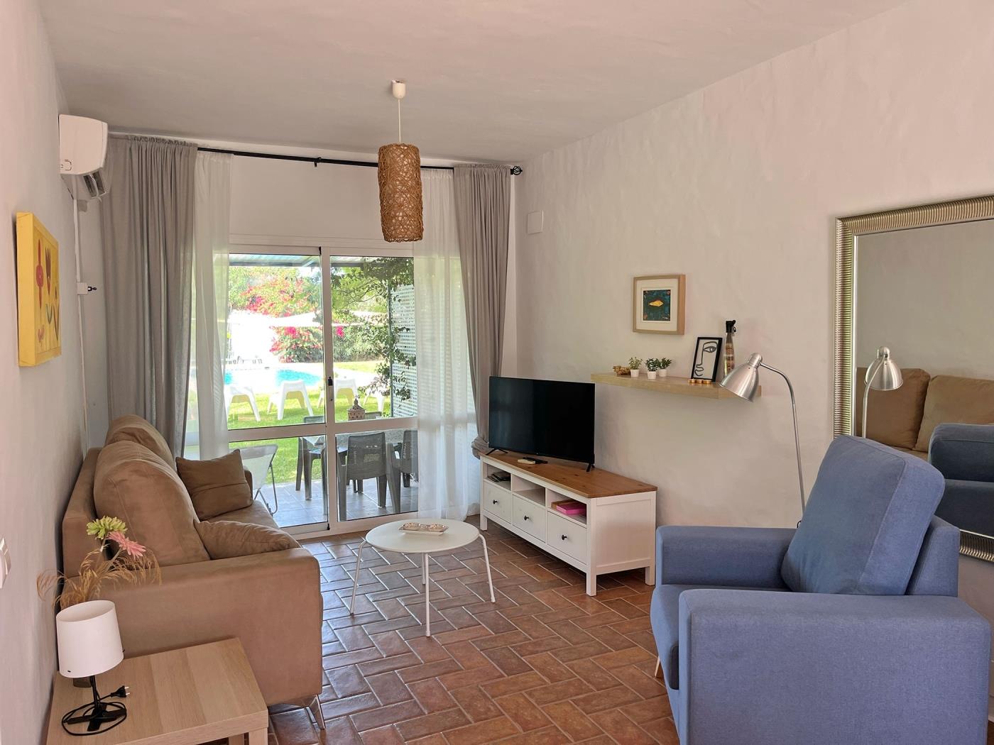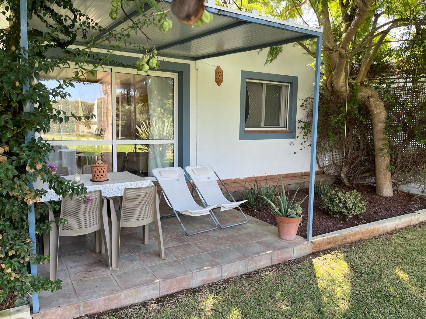 El bungalow cuenta con una terraza privada con vistas a la piscina compartida y una agradable zona de chill out, perfecta para relajarse al sol o disfrutar de las noches al aire libre.